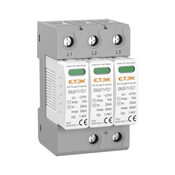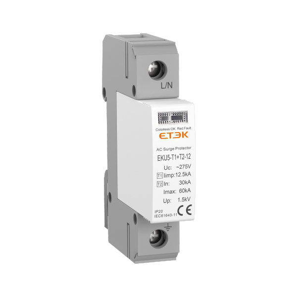 EKU5-T1+T2適用于交流50/60Hz,額定電壓為單相230V/三相400V的配電和控制系統(tǒng),滿足電涌保護(hù)器(SPD)I和II級(jí)試驗(yàn),用于抑制瞬態(tài)過電壓低于設(shè)備耐沖擊過電壓,泄放電涌能量,從而保護(hù)系統(tǒng)電路及設(shè)備。電涌保護(hù)器主要功能特點(diǎn): 具有L-PE、N-PE、L-N保護(hù)模式,適合各種電網(wǎng)系統(tǒng);具有老化過熱保護(hù)、本體劣化指示,采用插入式結(jié)構(gòu),可選遠(yuǎn)程報(bào)警功能。